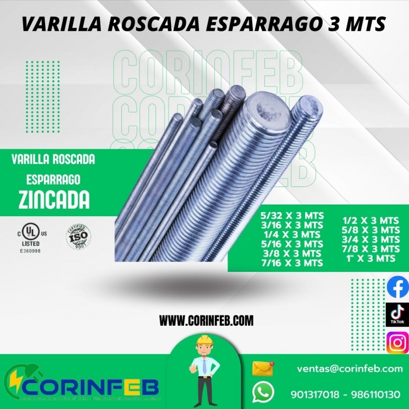 VARILLA ROSCADA ESPARRAGO DE 3 MTS DE 5/32 - 3/16 - 1/4 - 5/16 - 3/8 - 7/16 - 1/2 - 5/8 - 3/4 - 7/8 - 1"