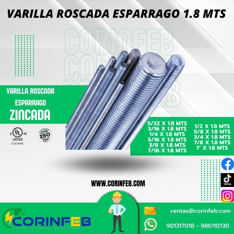 VARILLA ROSCADA ESPARRAGO ZINCADO DE 1.8 MTS DE 5/32 - 3/16 - 1/4 - 5/16 - 3/8 - 7/16 - 1/2 - 5/8 - 3/4 - 7/8 - 1´´