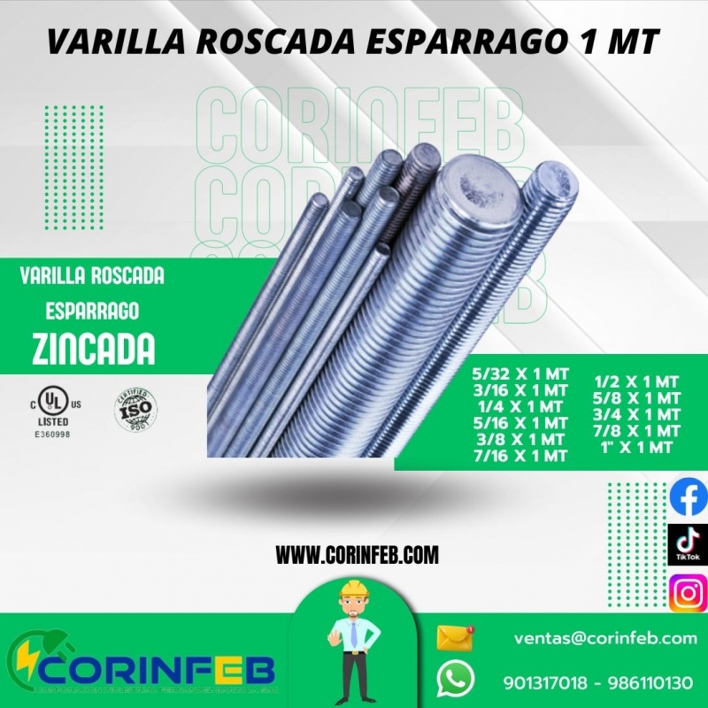 VARILLA ROSCADA ESPARRAGO DE 1 MTS DE 5/32 - 3/16 - 1/4 - 5/16 - 3/8 - 7/16 - 1/2 - 5/8 - 3/4 - 7/8 - 1"