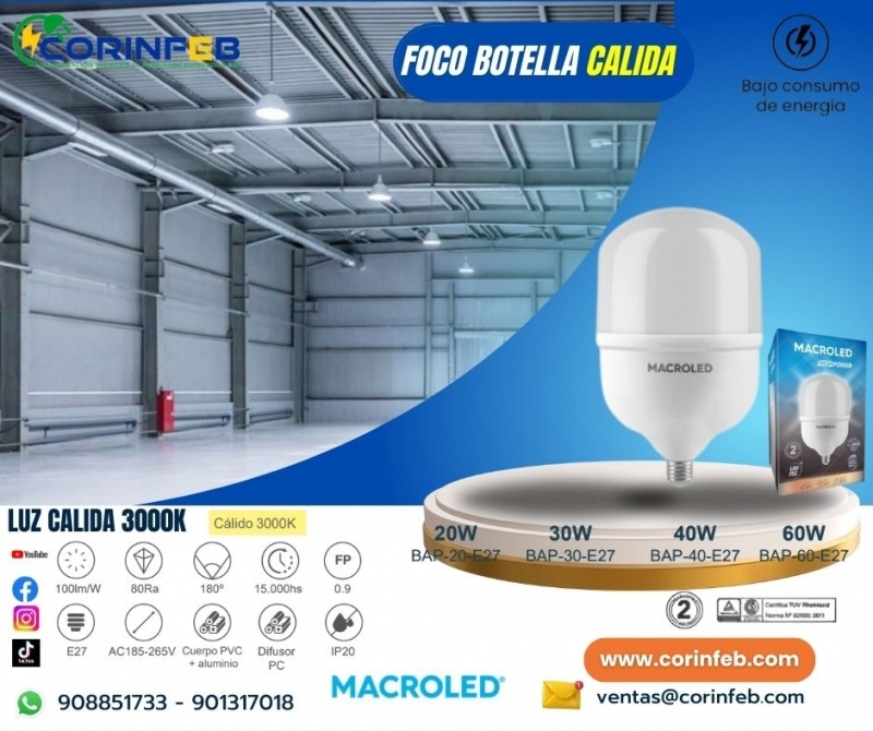 FOCO BOTELLA BAP CALIDA BULBON ALTA POTENCIA MACROLED 30W E27 AC180-240V CALIDO 3000K